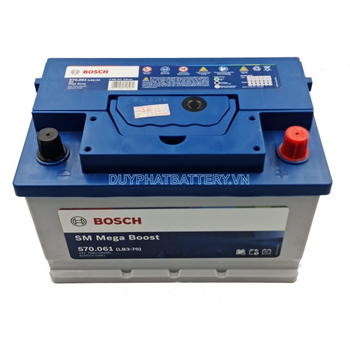 Bình ắc quy Bosch DIN 570.061 có kích thước quy chuẩn LB3 (Chiều dài bình ắc quy tối đa 276mm), cọc nghịch, kiểu cọc tiêu chuẩn, thuộc phân khúc Bosch SM Mega Boost là sự lựa chọn tối ưu dành cho các dòng xe tiêu chuẩn không có công nghệ dừng khởi động Start-Stop với năng lượng mạnh mẽ cùng hiệu suất khởi động ổn định