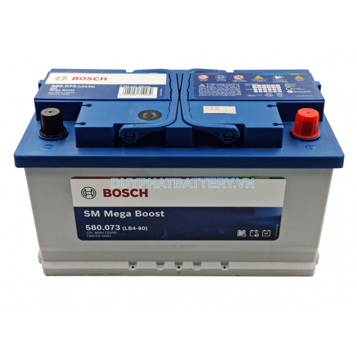 Bình ắc quy Bosch DIN 580.073 có kích thước quy chuẩn LB4 (Chiều dài bình ắc quy tối đa 314mm), cọc nghịch, kiểu cọc tiêu chuẩn, thuộc phân khúc Bosch SM Mega Boost là sự lựa chọn tối ưu dành cho các dòng xe tiêu chuẩn không có công nghệ dừng khởi động Start-Stop với năng lượng mạnh mẽ cùng hiệu suất khởi động ổn định