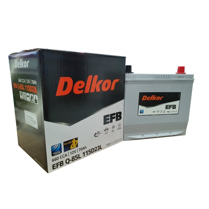 Bình ắc quy Delkor Q85L 115D23L là loại ắc quy kín khí, miễn bảo dưỡng công nghệ EFB, có kích thước quy chuẩn D23 (chiều dài ắc quy tối đa 23 cm), cọc nghịch, kiểu cọc chìm thuộc phân khúc Delkor EFB Calcicum với nhiều ưu điểm và chất lượng vượt trội phù hợp cho các dòng xe Mazda có hỗ trợ istop như: Mazda 2, 3, 6, CX-5, CX-8,...