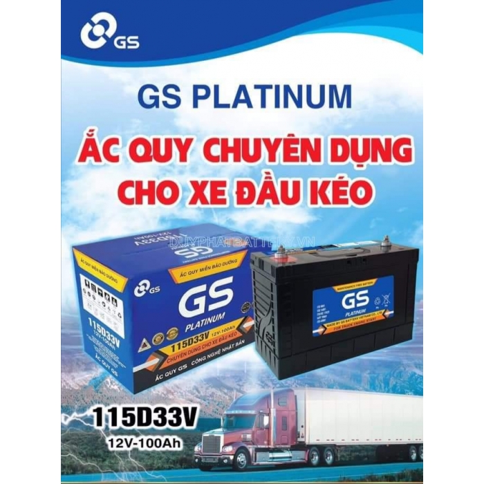 Bình ắc quy GS 115D33V (12V-100AH) do Công Ty TNHH Ắc Quy GS Việt Nam Sản Xuất, là một công ty 100% vốn nước ngoài, liên doanh giữa Tập Đoàn GS - YUASA - Nhà sản xuất Ắc Quy axit chì hàng đầu Châu Á, chuyên sản xuất các loại Bình Ắc Quy Ô Tô - Xe Máy và Tập Đoàn MITSUBISHI - Tập Đoàn thương mại lớn nhất Nhật Bản.