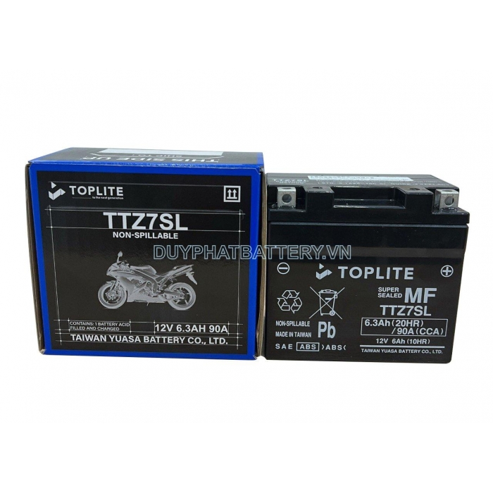 Bình ắc quy TOPLITE TTZ7SL với thông số kỹ thuật là 12V-6Ah-CCA-90A, thường được sử dụng cho các loại xe máy thể thao nhỏ như Yamaha R15, Honda CBR150R, Suzuki Raider, Yamaha Exciter, Yamaha Sirius, Yamaha FZ16, Honda Winner, Honda Sonic, Honda CB150R, Kawasaki Z125, Kawasaki Ninja 250SL, SYM Shark...và một số dòng xe máy khác.