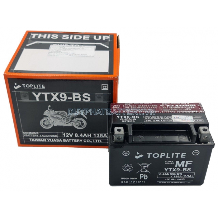 Bình ắc quy TOPLITE YTX9-BS được thiết kế và sản xuất để sử dụng cho nhiều loại xe máy khác nhau, đặc biệt là các loại xe phân khối lớn. Bình ắc quy này có dung lượng 8Ah và điện thế 12V, CCA 120A. Nó có thể phù hợp với các loại xe máy như Yamaha Exciter, Yamaha R15, Honda CBR150R, Honda CB150R, Kawasaki Z1000, Suzuki GSX-R1000 và nhiều loại xe máy khác.