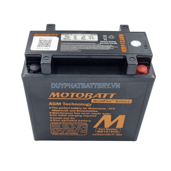 Bình ắc quy MOTOBATT MBYZ16HD (12V-16.5Ah) là loại ắc quy AGM, kín khí, không cần bảo dưỡng thuộc phân khúc Motobatt Quadflex được cấp bằng sáng chế giúp việc lắp đặt ắc quy xe mô tô phân khối lớn trở nên dễ dàng hơn với 4 thiết bị đầu cos. Được tối đa hóa kích thước các tấm bên trong ắc quy, tận dụng không gian bên trong hộp ắc quy tiêu chuẩn. Ngoài ra, các tấm lưới được làm dày hơn với mật độ dán tấm bổ sung dẫn đến sự gia tăng đáng kể công suất, độ bền và dòng khởi động CCA.